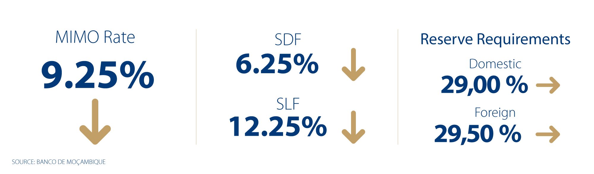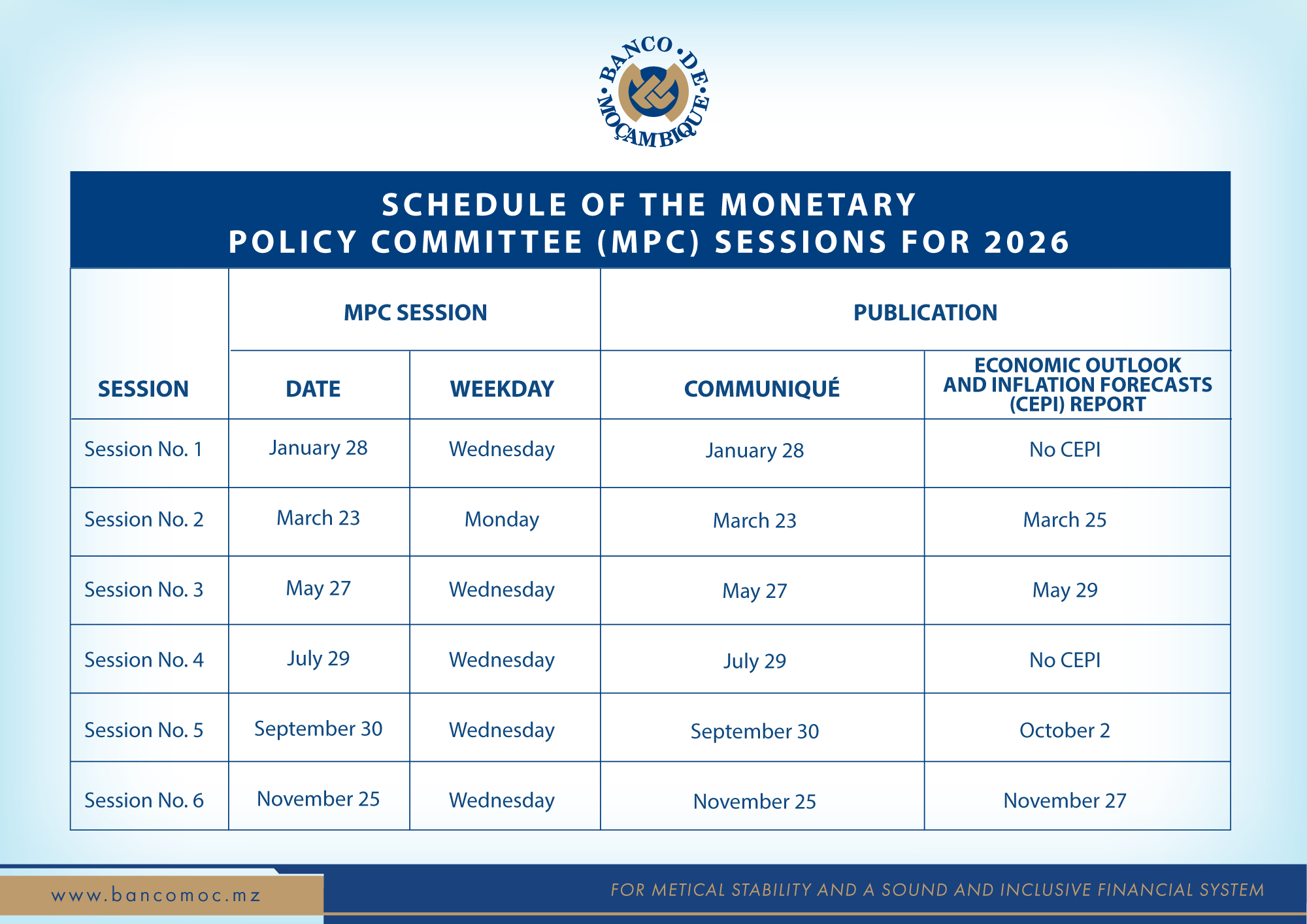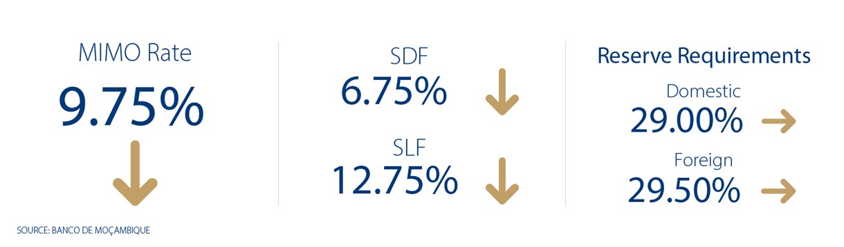 The Monetary Policy Committee (MPC) of the Banco de Moçambique (BM) is responsible for managing and implementing monetary policy. The body comprises the Governor, Deputy-Governor and BM Board Members, and meets every two months to determine the monetary policy rate, i.e., Mozambique Interbank Money Market Rate (MIMO).