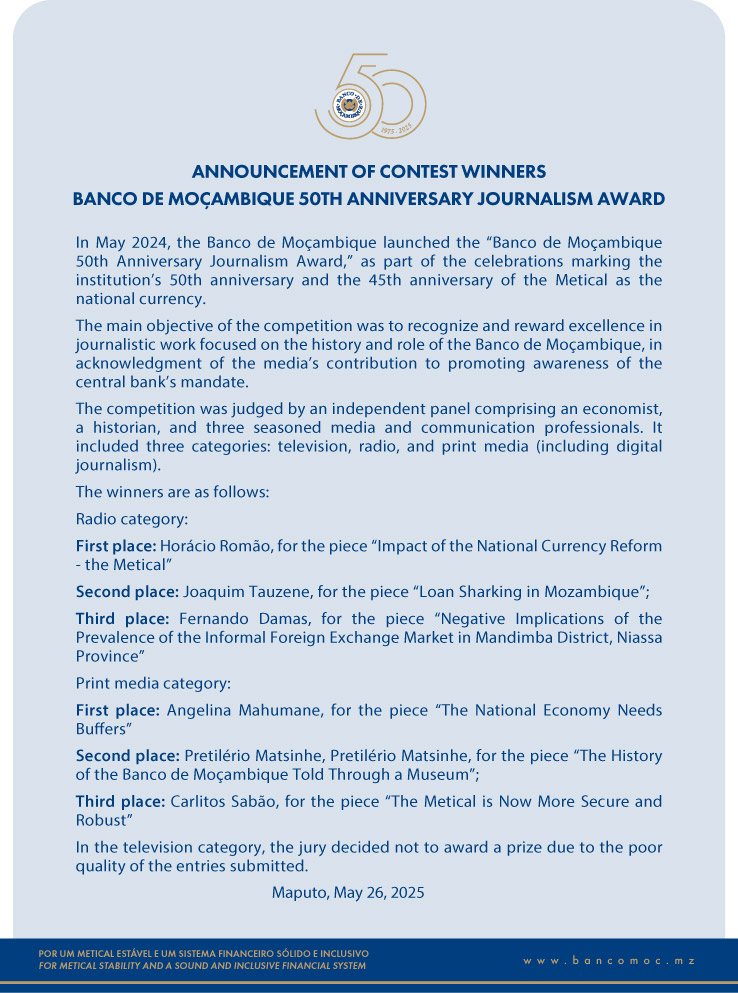 ANNOUNCEMENT OF CONTEST WINNERS BANCO DE MOÇAMBIQUE 50TH ANNIVERSARY JOURNALISM AWARD