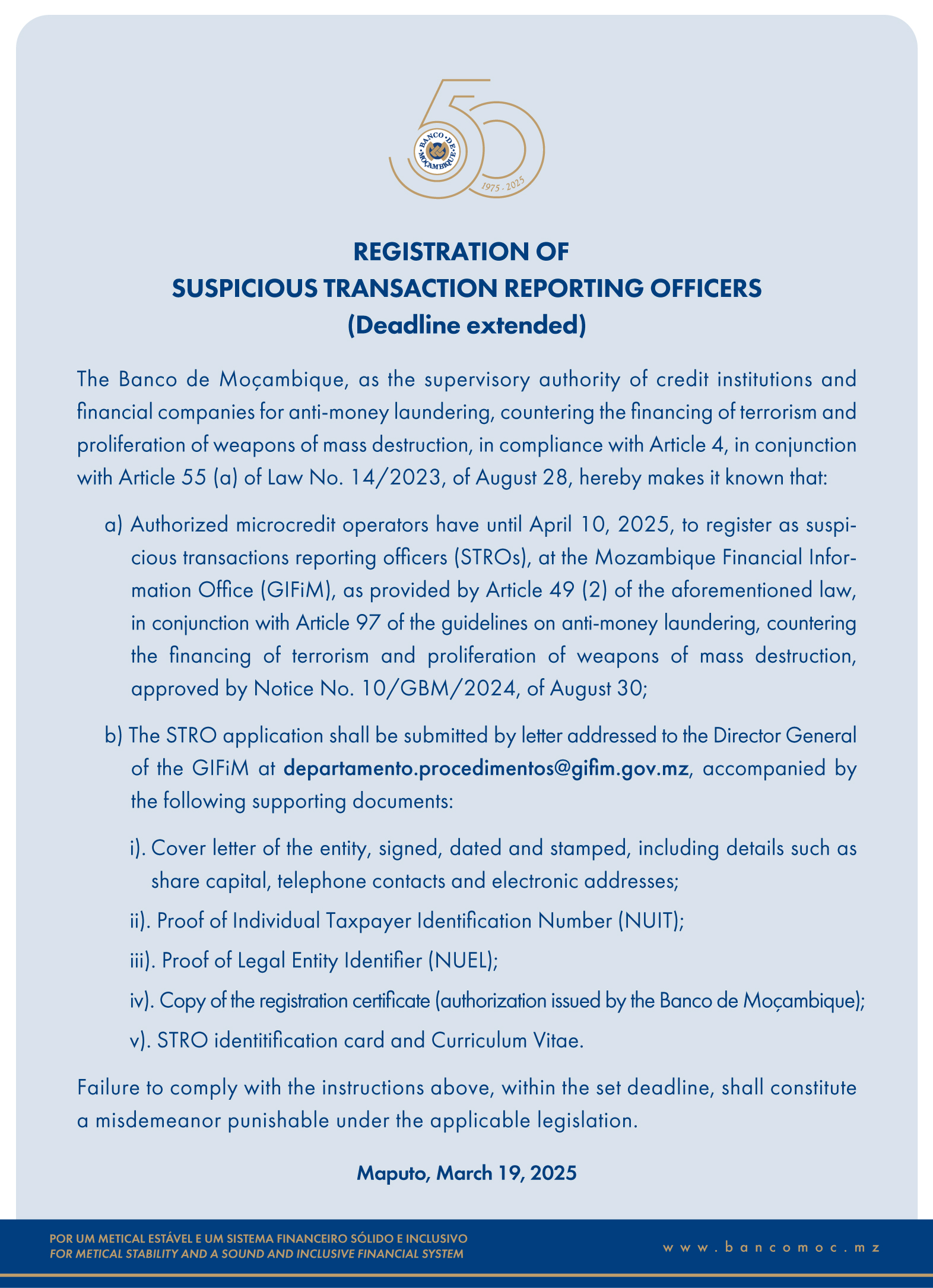 BANCO DE MOÇAMBIQUE EXTENDS DEADLINE FOR REGISTRATION OF SUSPICIOUS TRANSACTION REPORTING OFFICERS