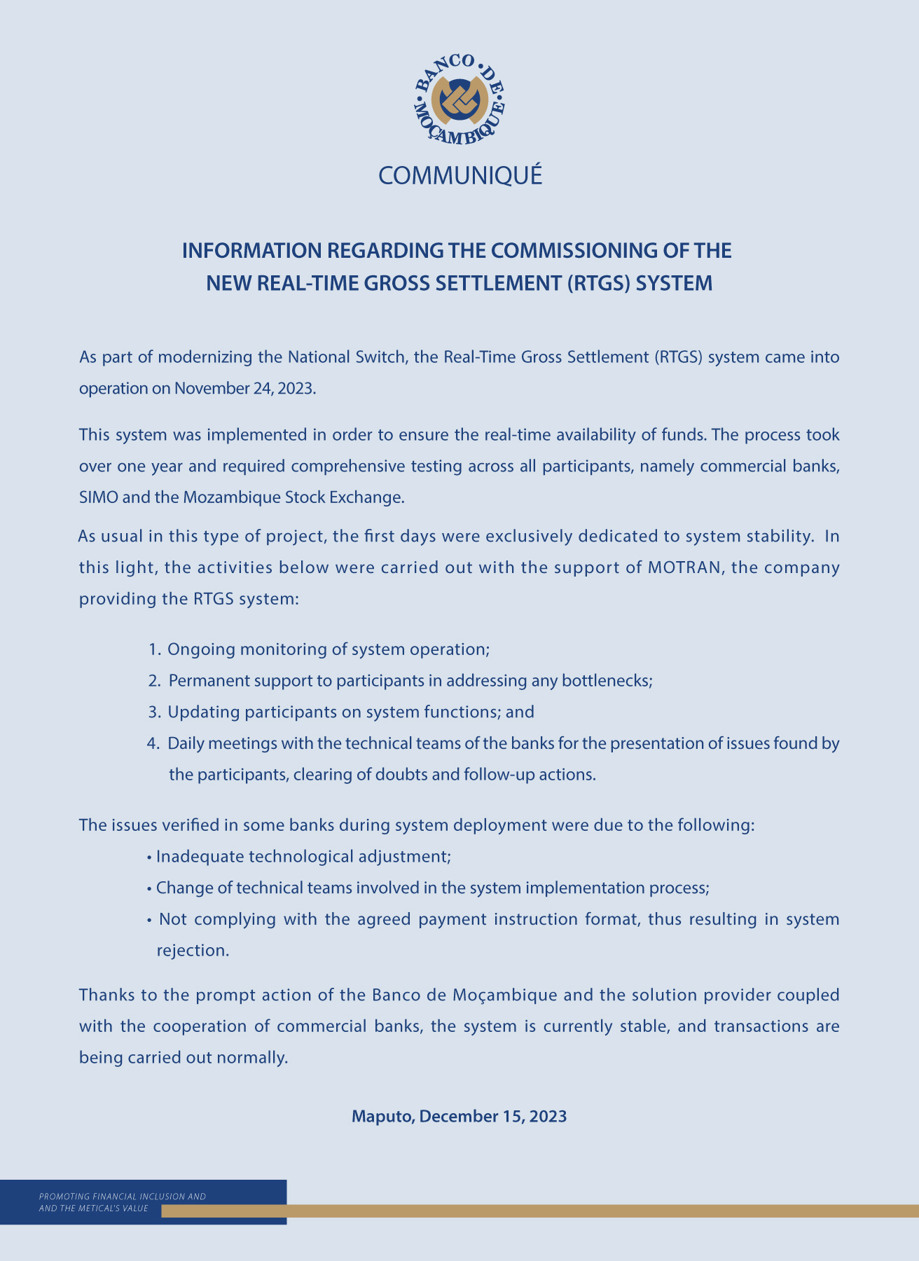 INFORMATION REGARDING THE COMMISSIONING OF THE NEW REAL-TIME GROSS SETTLEMENT (RTGS) SYSTEM