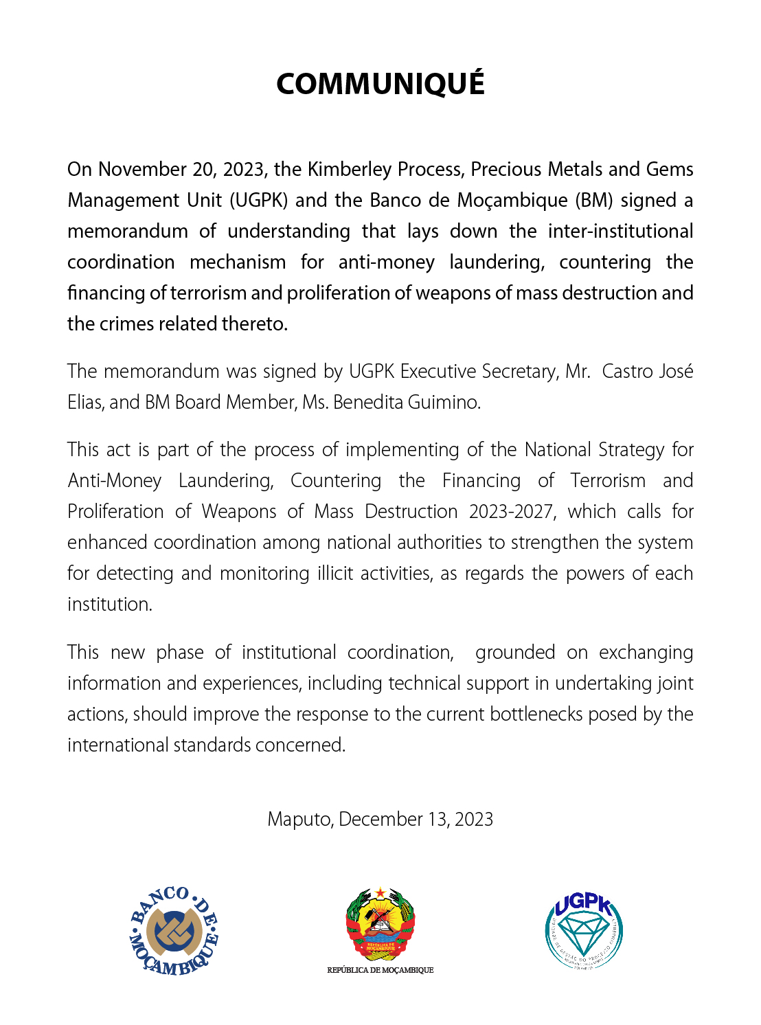 KIMBERLEY PROCESS MANAGEMENT UNIT AND BANCO DE MOÇAMBIQUE SIGN MEMORANDUM OF UNDERSTANDING