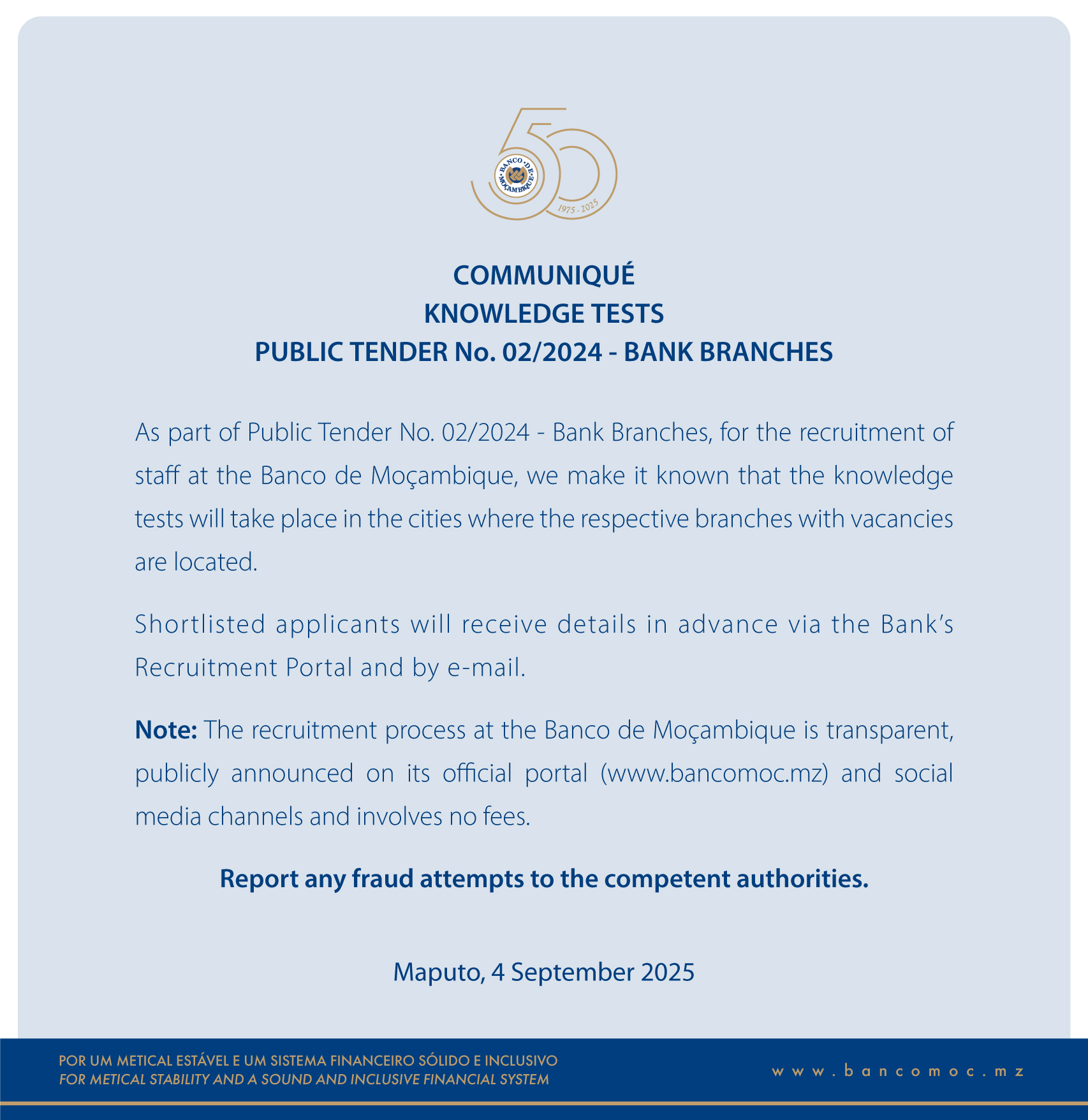 KNOWLEDGE TEST VENUES - PUBLIC TENDER No. 02/2024 - BANK BRANCHES