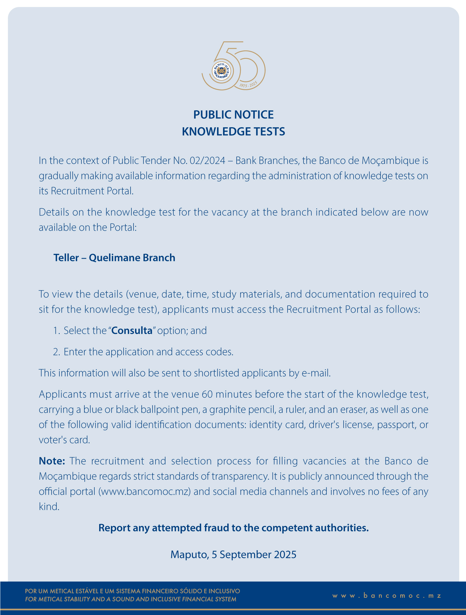 KNOWLEDGE TESTS: PUBLIC TENDER NO. 02/2024 – BANK BRANCHES
