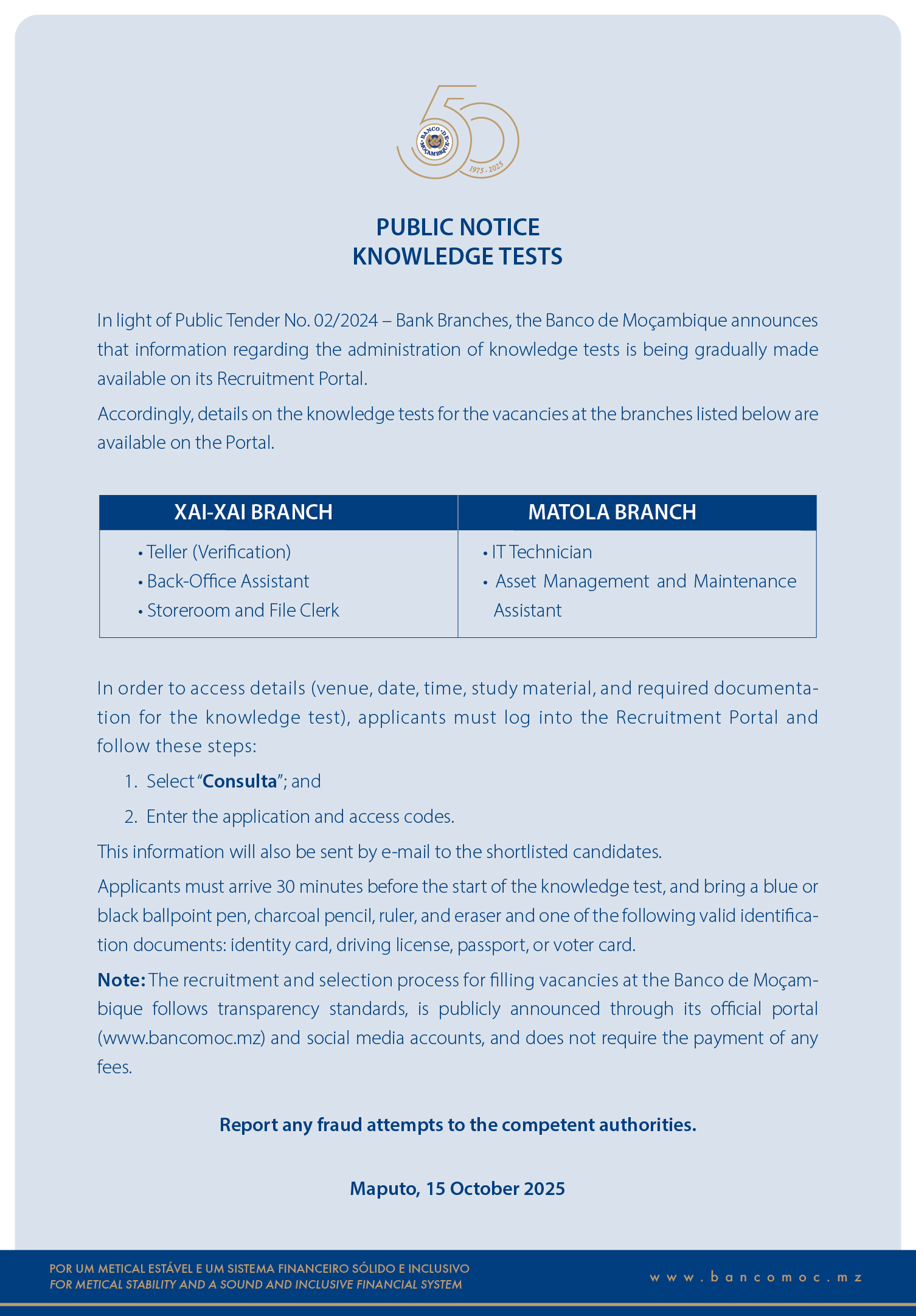 KNOWLEDGE TESTS: PUBLIC TENDER No. 02/2024 - XAI-XAI AND MATOLA BRANCHES