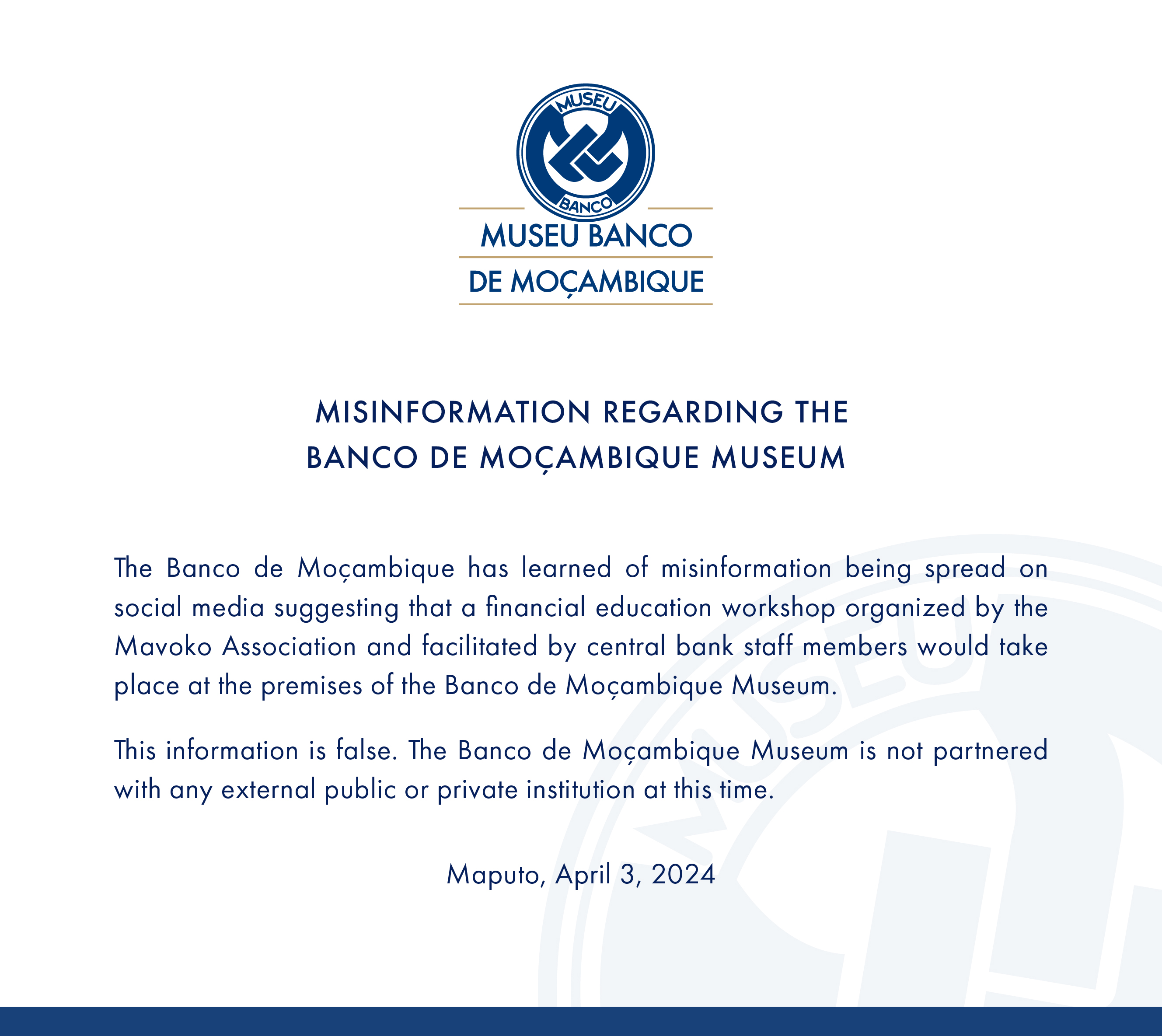 MISINFORMATION REGARDING THE BANCO DE MOÇAMBIQUE MUSEUM
