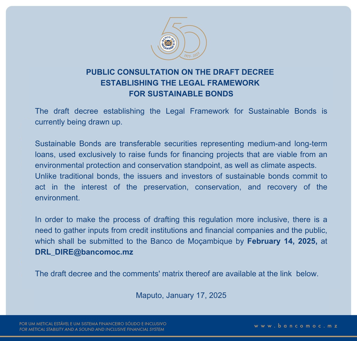 PUBLIC CONSULTATION ON THE DRAFT DECREE ESTABLISHING THE LEGAL FRAMEWORK FOR SUSTAINABLE BONDS