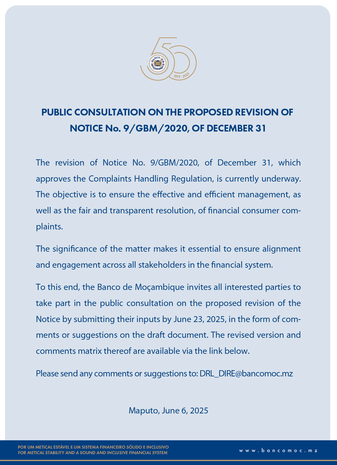 PUBLIC CONSULTATION ON THE PROPOSED REVISION OF NOTICE No. 9/GBM/2020, OF DECEMBER 31 WHICH APPROVES THE COMPLAINTS HANDLING REGULATION