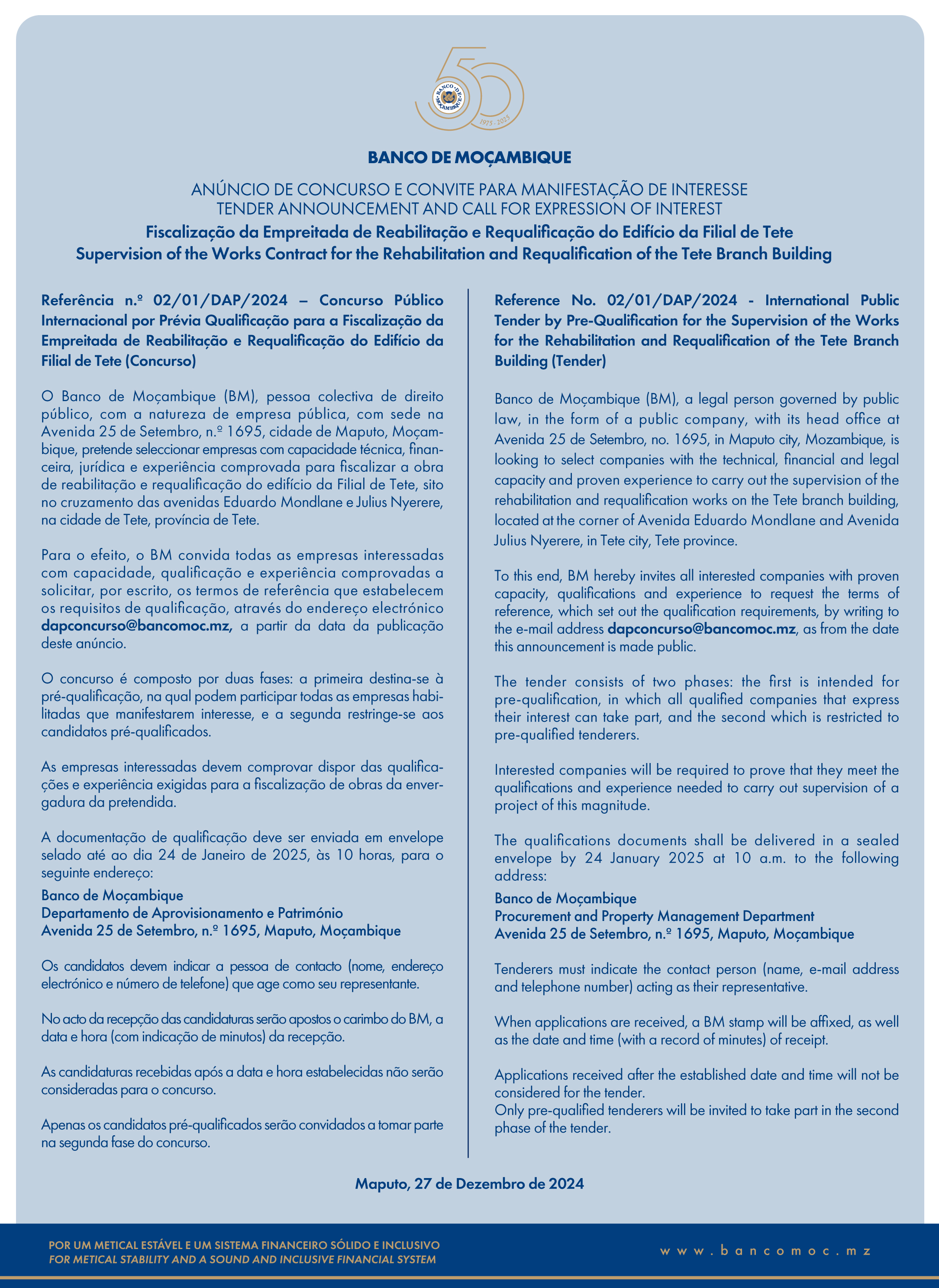 TENDER ANNOUNCEMENT AND CALL FOR EXPRESSION OF INTEREST