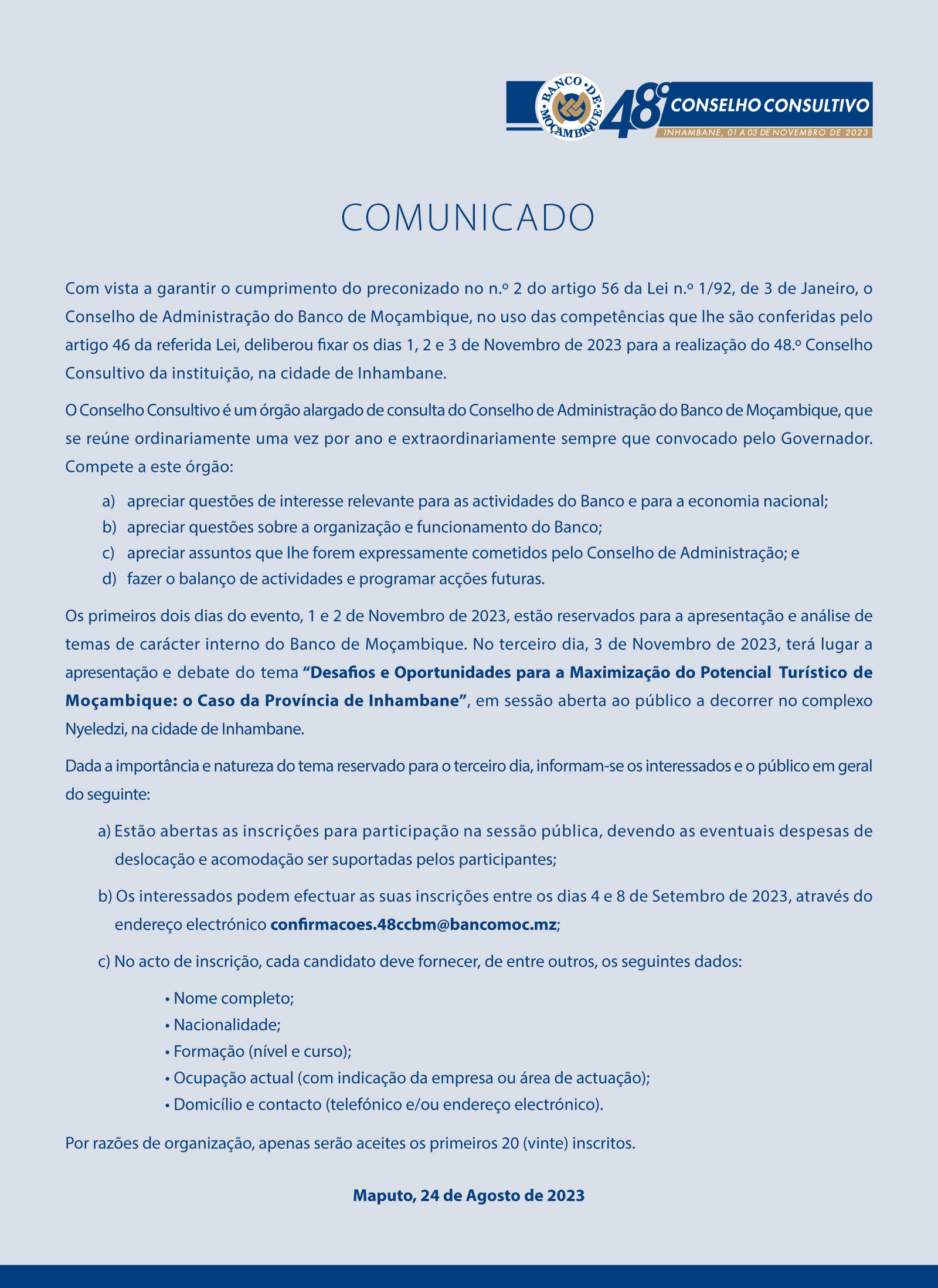 48.º CONSELHO CONSULTIVO - “DESAFIOS E OPORTUNIDADES PARA A MAXIMIZAÇÃO DO POTENCIAL TURÍSTICO DE MOÇAMBIQUE: O CASO DA PROVÍNCIA DE INHAMBANE”