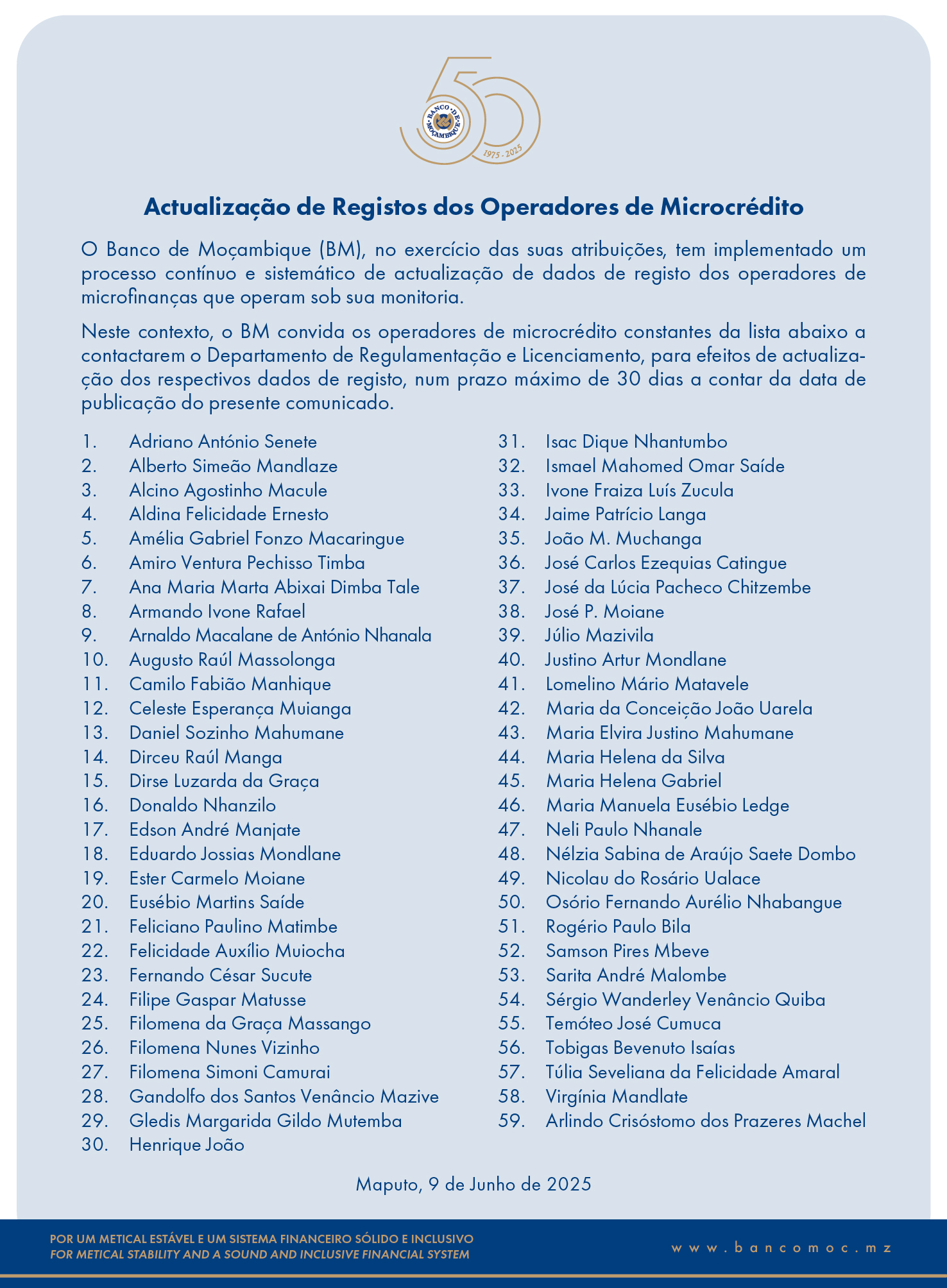ACTUALIZAÇÃO DE REGISTOS DOS OPERADORES DE MICROCRÉDITO
