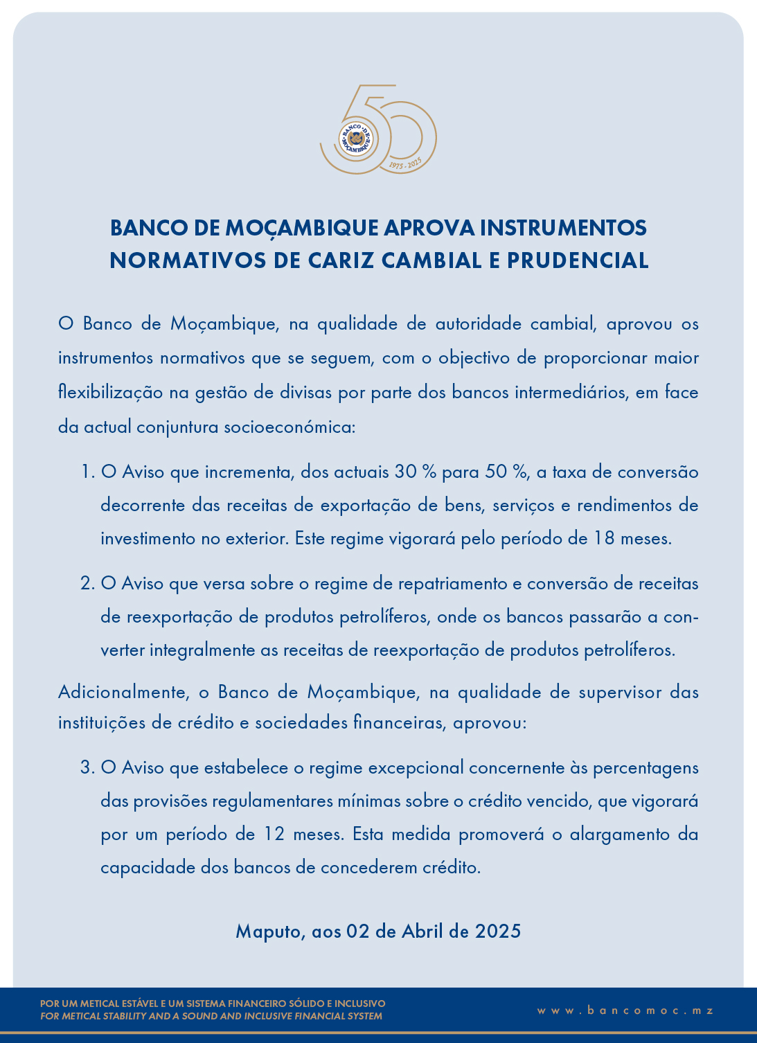 BANCO DE MOÇAMBIQUE APROVA INSTRUMENTOS NORMATIVOS DE CARIZ CAMBIAL E PRUDENCIAL