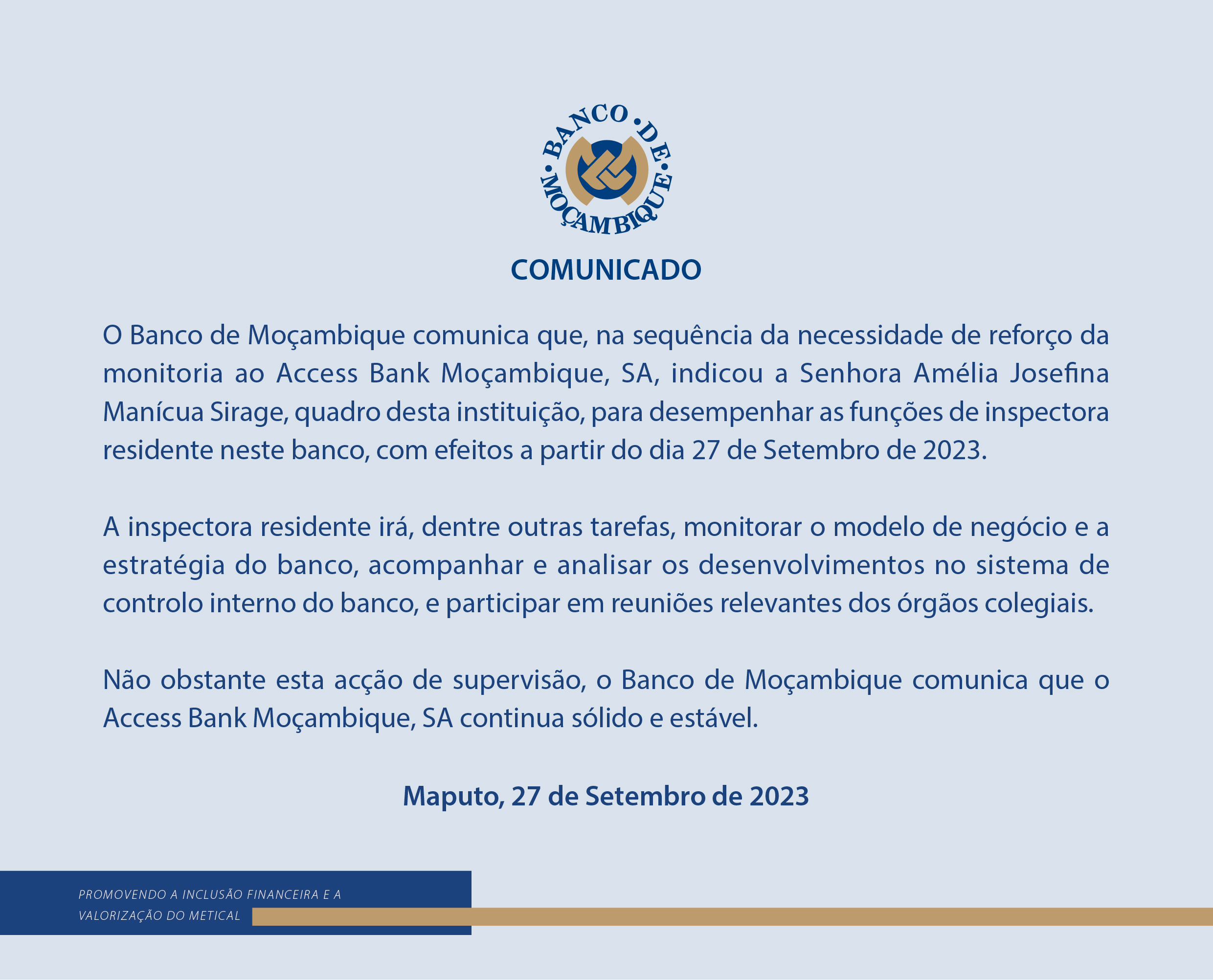 BANCO DE MOÇAMBIQUE INDICA INSPECTOR RESIDENTE NO ACCESS BANK MOÇAMBIQUE, SA
