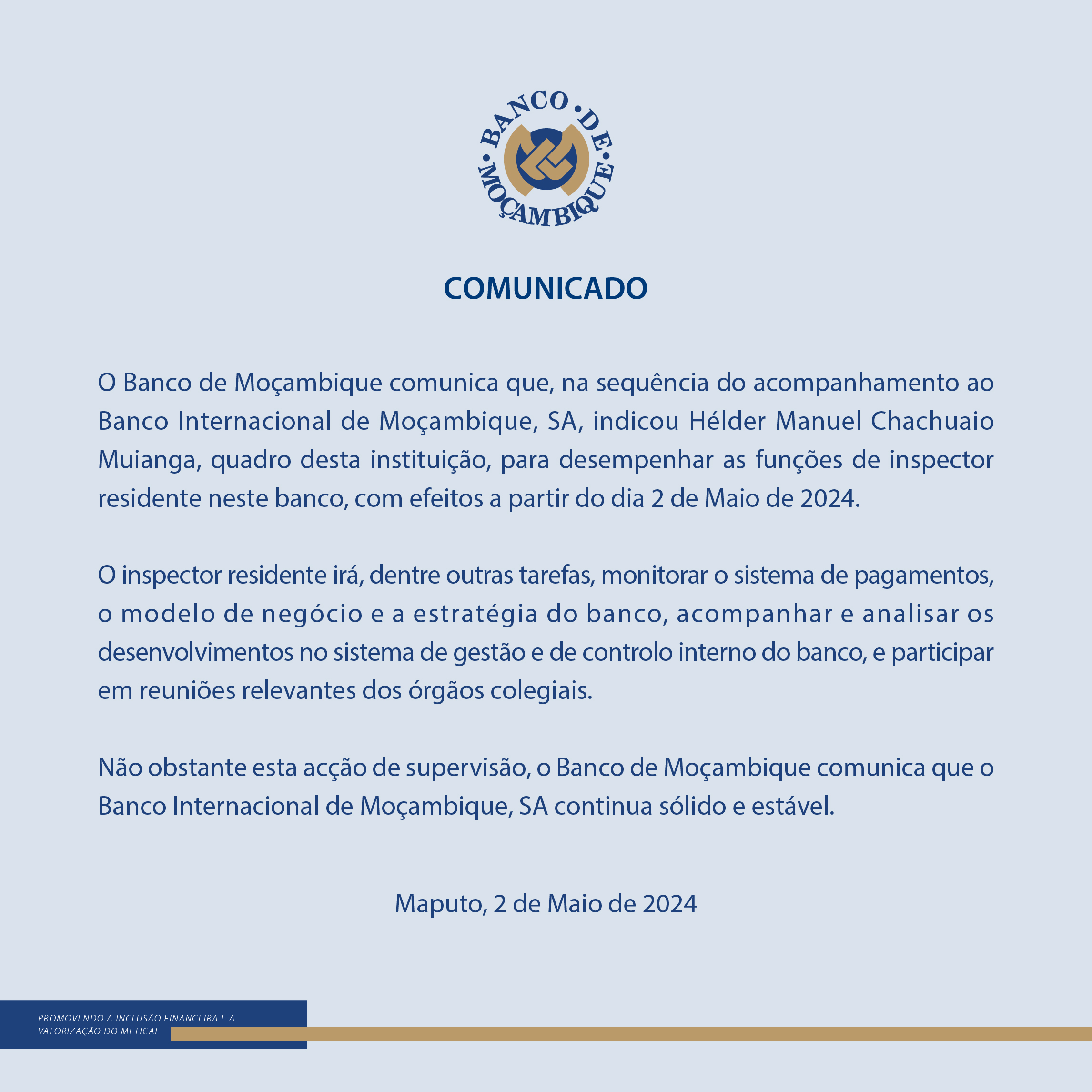 BANCO DE MOÇAMBIQUE INDICA INSPECTOR RESIDENTE NO BANCO INTERNACIONAL DE MOÇAMBIQUE, SA