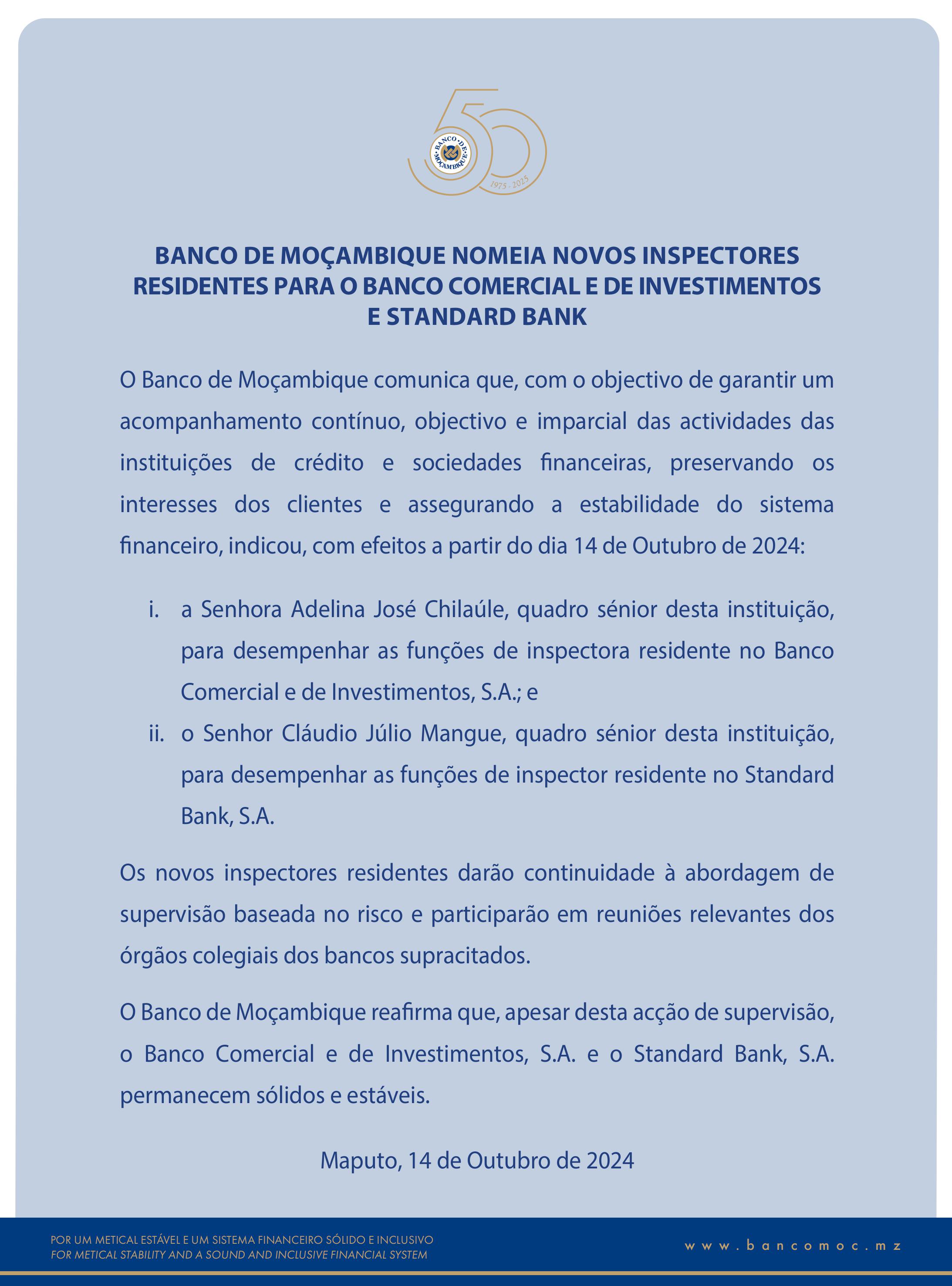 BANCO DE MOÇAMBIQUE NOMEIA NOVOS INSPECTORES RESIDENTES PARA O BANCO COMERCIAL E DE INVESTIMENTOS E STANDARD BANK