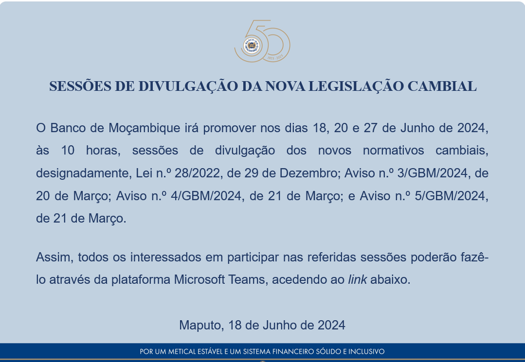 BANCO DE MOÇAMBIQUE PROMOVE SESSÕES DE DIVULGAÇÃO DA NOVA LEGISLAÇÃO CAMBIAL
