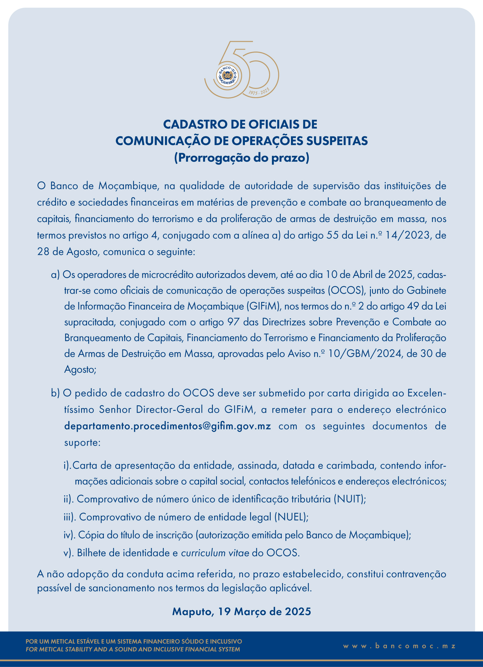 BANCO DE MOÇAMBIQUE PRORROGA PRAZO PARA CADASTRO DE OFICIAIS DE COMUNICAÇÃO DE OPERAÇÕES SUSPEITAS