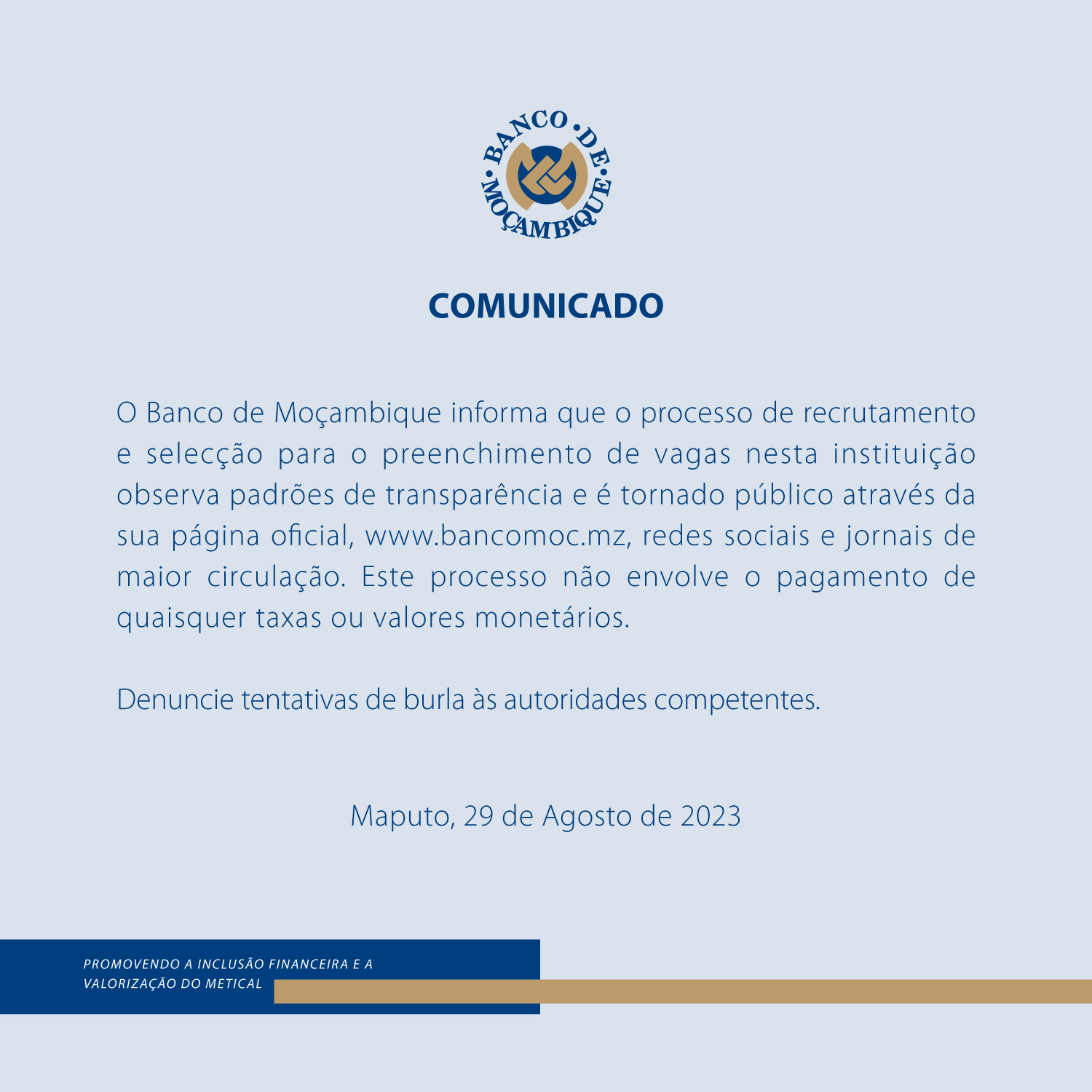 COMUNICADO SOBRE O PROCESSO DE RECRUTAMENTO E SELECÇÃO NO BANCO DE MOÇAMBIQUE