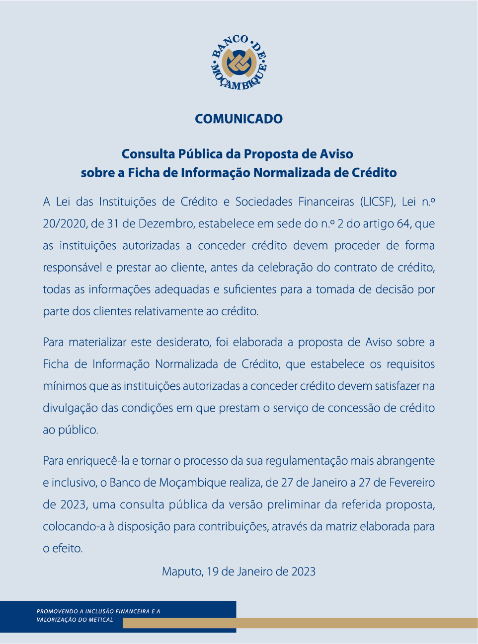 Proposta de Aviso sobre a Ficha de Informação Normalizada de Crédito 21.12.2022