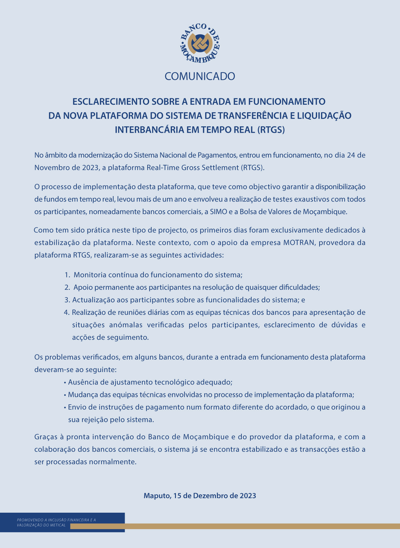 ESCLARECIMENTO SOBRE A ENTRADA EM FUNCIONAMENTO DA NOVA PLATAFORMA DO SISTEMA DE TRANSFERÊNCIA E LIQUIDAÇÃO INTERBANCÁRIA EM TEMPO REAL (RTGS)‎