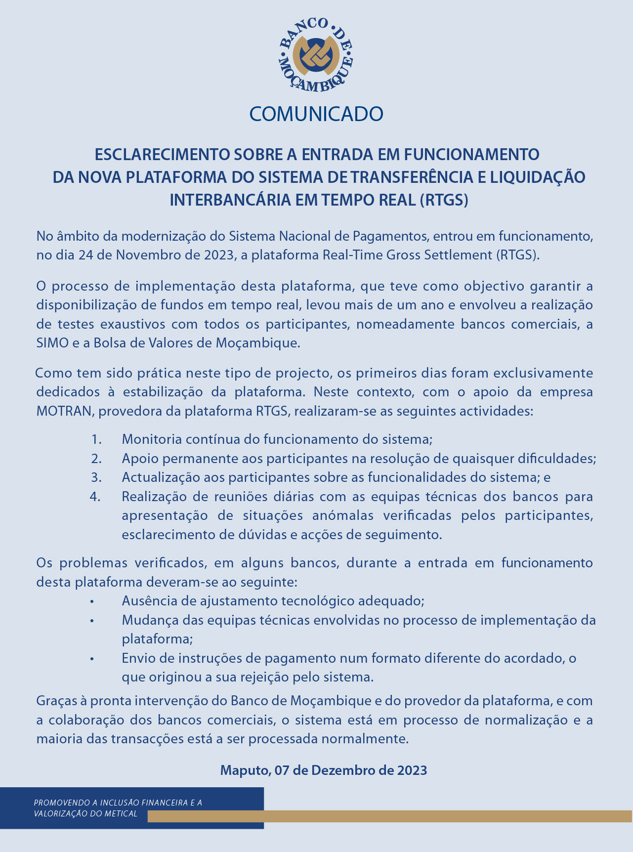 ESCLARECIMENTO SOBRE A ENTRADA EM FUNCIONAMENTO DA NOVA PLATAFORMA DO SISTEMA DE TRANSFERÊNCIA E LIQUIDAÇÃO INTERBANCÁRIA EM TEMPO REAL - RTGS