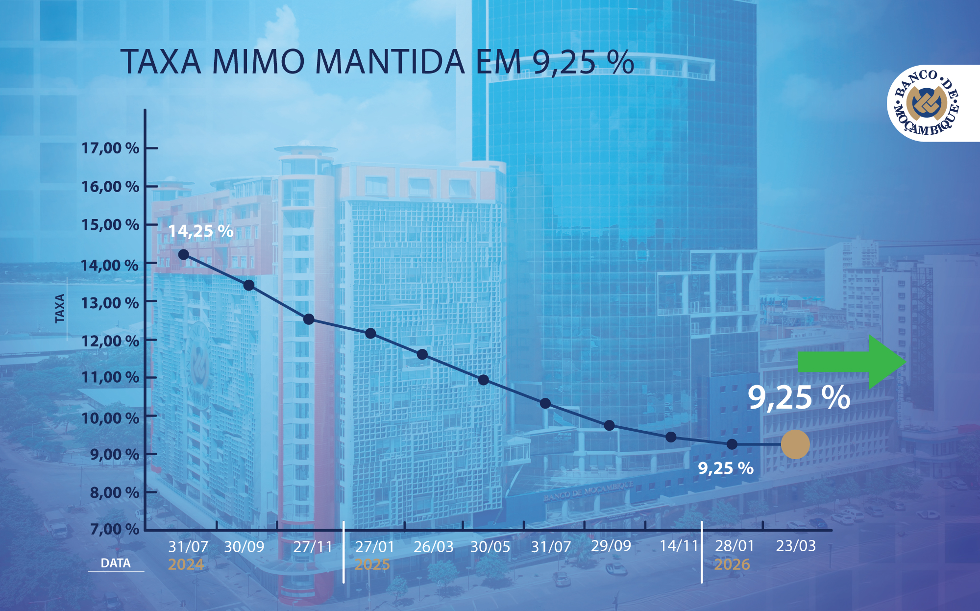 O Comité de Política Monetária (CPMO) do Banco de Moçambique decidiu manter a taxa de juro de política monetária, taxa MIMO, em 9,25 %. Esta decisão decorre da materialização e do agravamento substancial de alguns riscos e incertezas associados às projecções da inflação, com destaque para a eclosão do conflito no Médio Oriente e os seus impactos na cadeia logística, bem como na oferta e nos preços dos produtos energéticos e alimentares, que influenciaram a revisão em alta das perspectivas da inflação. Neste contexto, o CPMO interrompeu o ciclo de redução iniciado em Janeiro de 2024, condicionando as futuras decisões à evolução e materialização dos riscos e incertezas internos e externos.