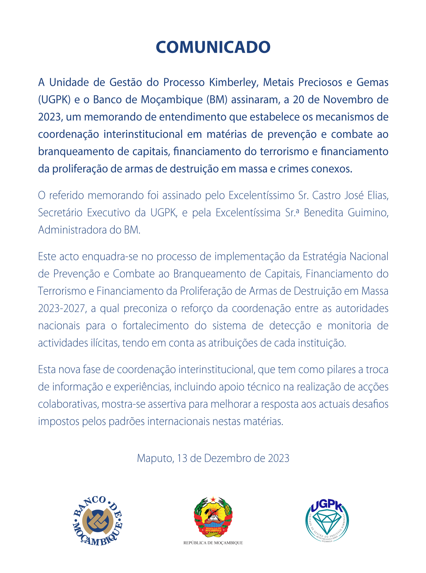 UNIDADE DE GESTÃO DO PROCESSO KIMBERLEY E BANCO DE MOÇAMBIQUE ASSINAM MEMORANDO DE ENTENDIMENTO