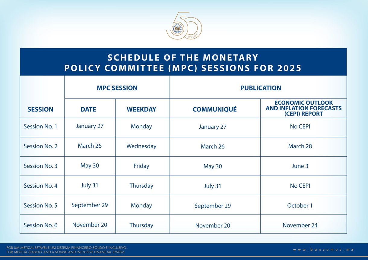 The Monetary Policy Committee (MPC) of the Banco de Moçambique (BM) is responsible for managing and implementing monetary policy. The body comprises the Governor, Deputy-Governor and BM Board Members, and meets every two months to determine the monetary policy rate, i.e., Mozambique Interbank Money Market Rate (MIMO).