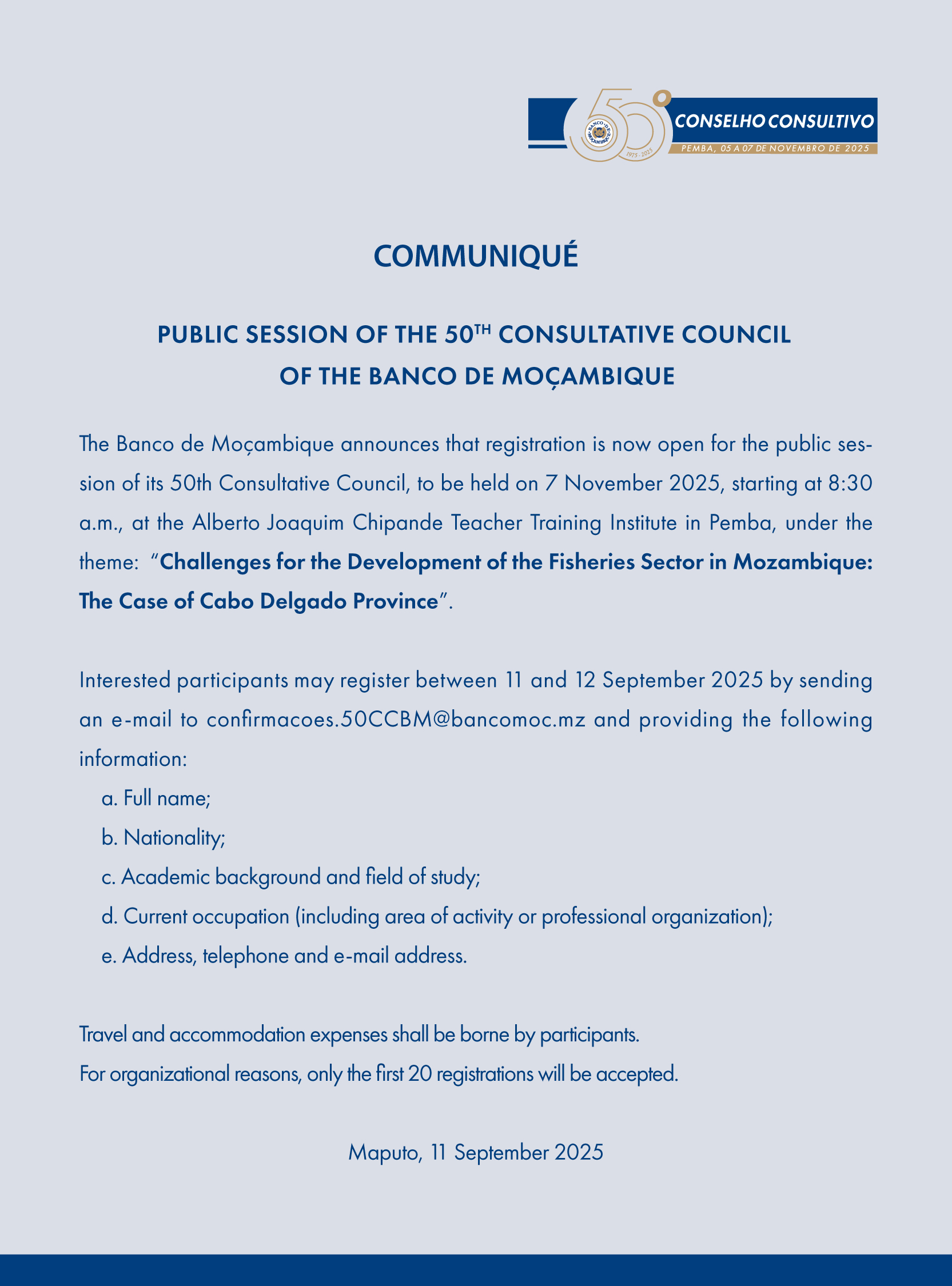 The Banco de Moçambique announces that registration is now open for the public session of its 50th Consultative Council.