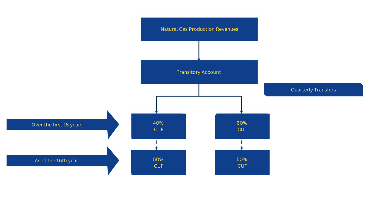 Revenues from liquefied natural gas production from areas 1 and 4, offshore of the Rovuma Basin, and future oil and natural gas development and production projects, deposited in the Treasury's Single Account (CUF – transitory oil and gas revenues), domiciled in the Banco de Moçambique, are distributed quarterly as follows: