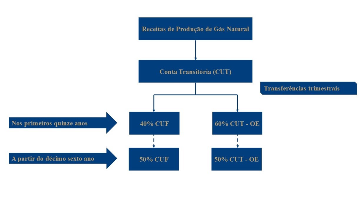 As receitas da produção de gás natural liquefeito provenientes das Áreas 1 e 4, Offshore da Bacia do Rovuma e futuros projectos de desenvolvimento e produção de petróleo e gás natural, depositadas na Conta Única do Tesouro (CUT – Receitas Transitórias de Petróleo e Gás), domiciliada no Banco de Moçambique, são repartidas trimestralmente da seguinte forma: