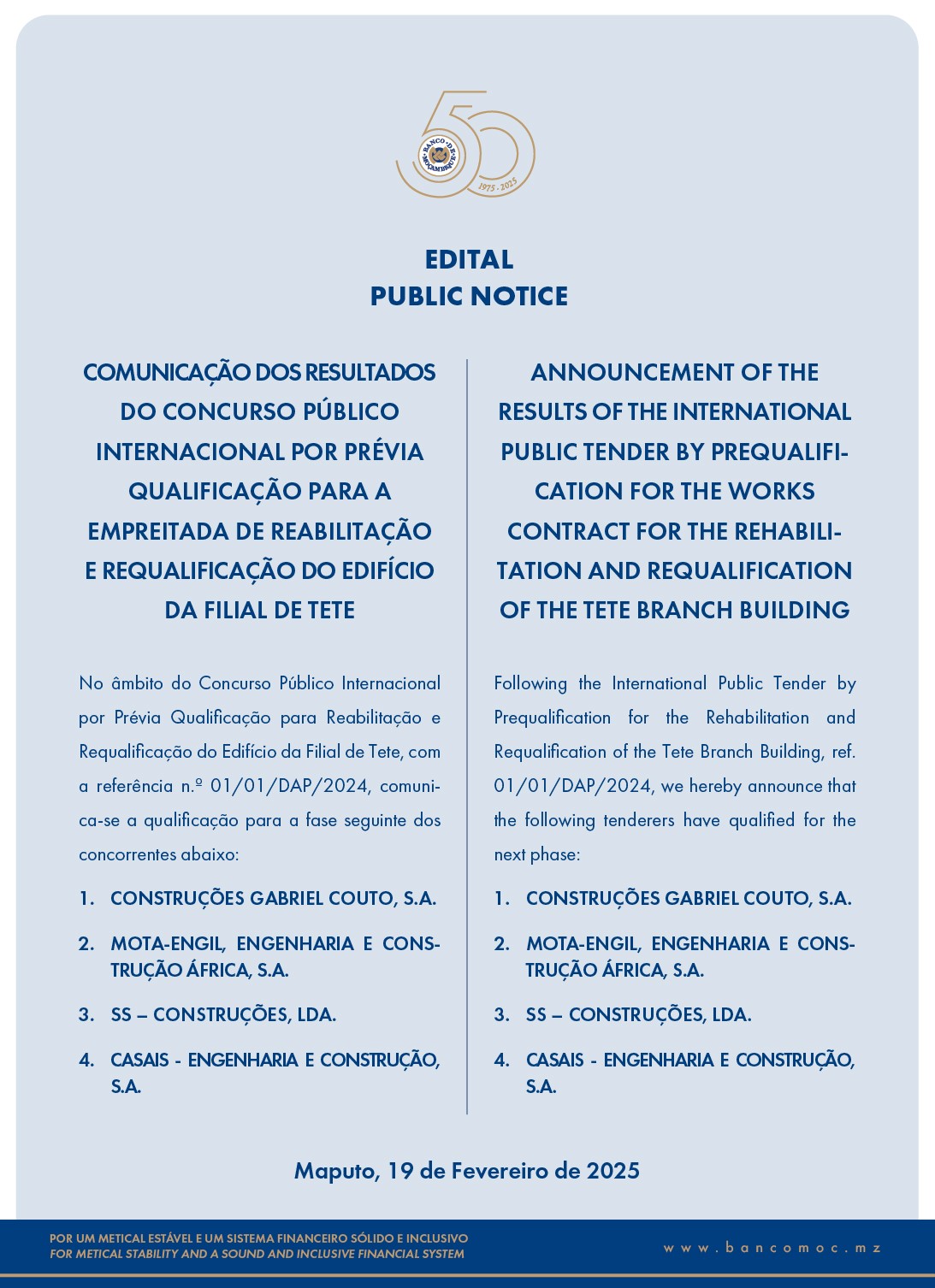 BANCO DE MOÇAMBIQUE ANUNCIA RESULTADOS DO CONCURSO PÚBLICO INTERNACIONAL POR PRÉVIA QUALIFICAÇÃO PARA A EMPREITADA DE REABILITAÇÃO E REQUALIFICAÇÃO DO EDIFÍCIO DA FILIAL DE TETE