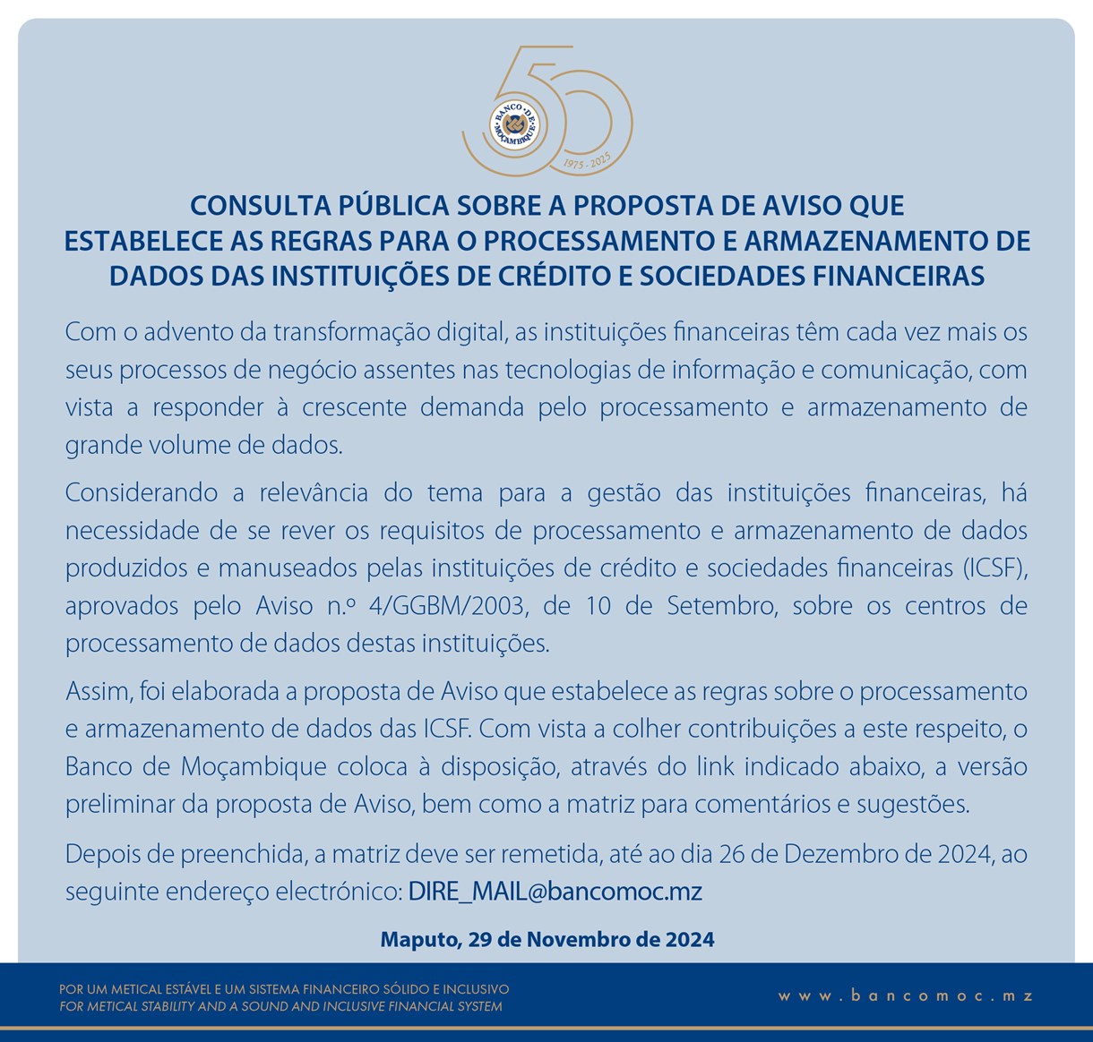 CONSULTA PÚBLICA SOBRE A PROPOSTA DE AVISO QUE ESTABELECE AS REGRAS PARA O PROCESSAMENTO E ARMAZENAMENTO DE DADOS DAS INSTITUIÇÕES DE CRÉDITO E SOCIEDADES FINANCEIRAS