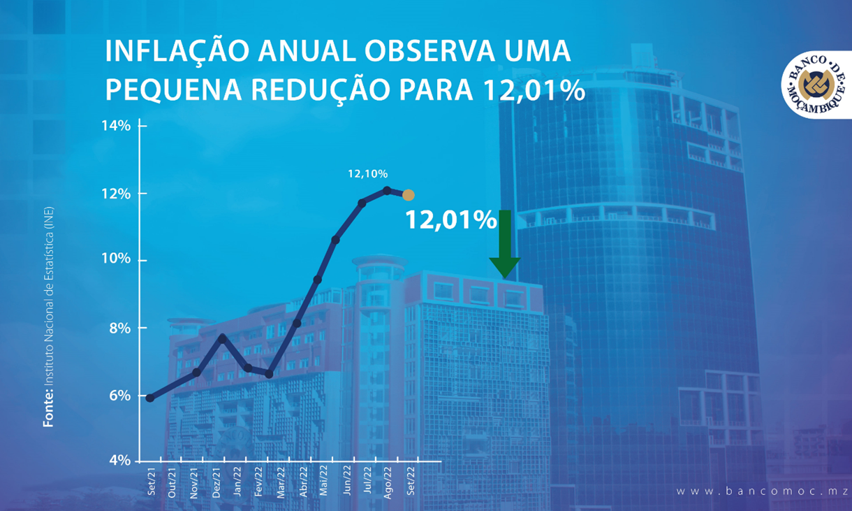 A inflação anual, em Setembro, observou uma pequena redução para 12,01%. Este comportamento reflecte, essencialmente, a desaceleração registada nos preços dos serviços de restauração e hotelaria, bem como de vestuário e calçado.