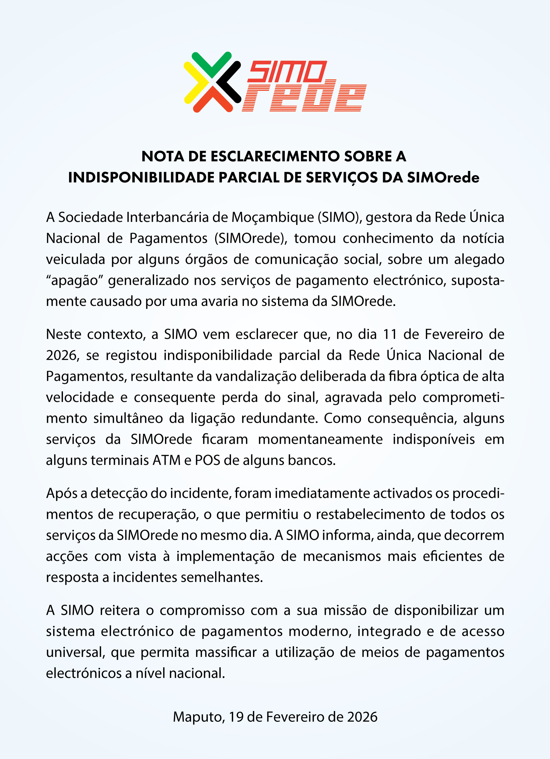 A Sociedade Interbancária de Moçambique (SIMO), gestora da Rede Única Nacional de Pagamentos vem esclarecer que, no dia 11 de Fevereiro de 2026, se registou indisponibilidade parcial da SIMOrede, resultante da vandalização deliberada da fibra óptica de alta velocidade e consequente perda do sinal, agravada pelo comprometimento simultâneo da ligação redundante.