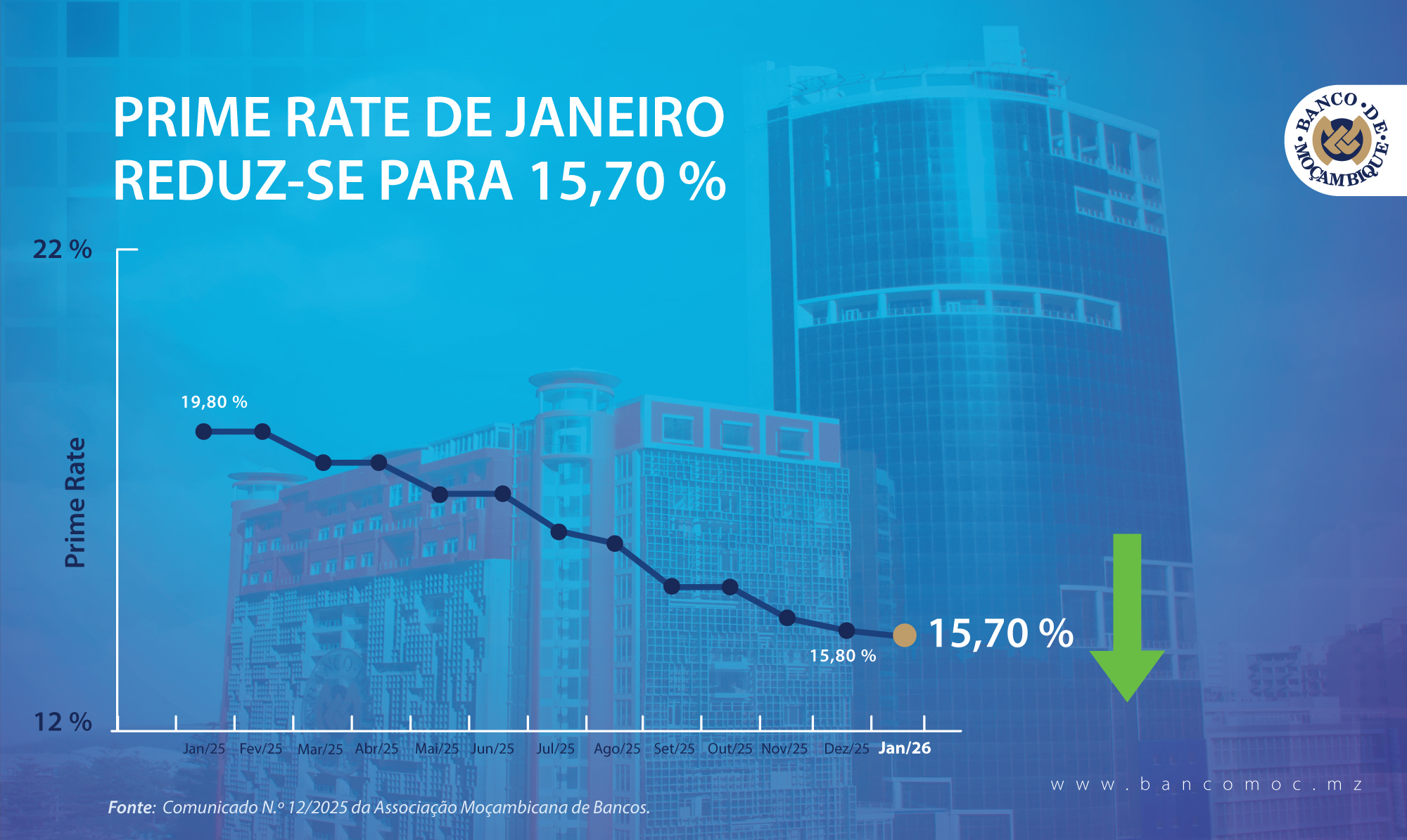 No quadro da implementação do Acordo sobre o Indexante Único do Sistema Bancário Moçambicano, a Associação Moçambicana de Bancos comunica o indexante único, o prémio de custo e a prime rate a vigorar no mês de Janeiro de 2026.