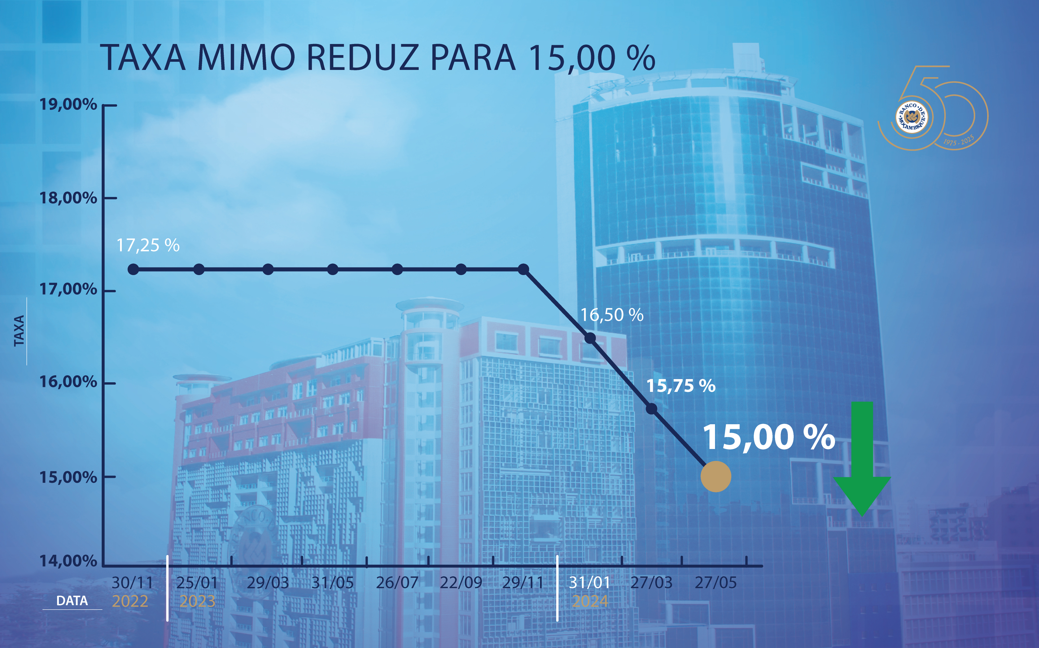O Comité de Política Monetária (CPMO) do Banco de Moçambique decidiu reduzir a taxa de juro de política monetária, taxa MIMO, de 15,75 % para 15,00 %.